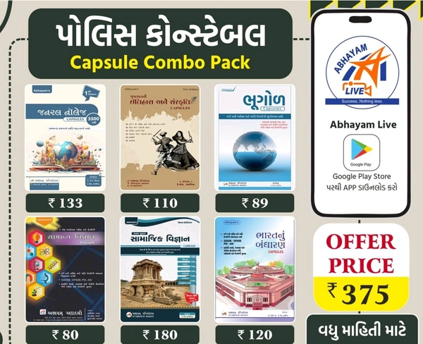 અભયમ પોલીસ કોન્સ્ટેબલ સ્પેશલ કેપ્સુલ સેટ 🚨 છોટા પેકેટ – બડા ધમાકા! 🚨 📚 પોલીસ કોન્સ્ટેબલ & PSI માટે 6 કેપ્સુલ બુક કોમ્બો પેક ઓછા પેજમાં વધુ મુદ્દા, ફટાફટ રિવિઝન અને પક્કી તૈયારી 💪 આ કોમ્બો ખાસ તે વિદ્યાર્થીઓ માટે છે જે સ્માર્ટ સ્ટડી કરી સફળતા મેળવવા માંગે છે. https://www.book4u.co.in/products/product-19218 ✅ જનરલ નોલેજ ✅ ગુજરાતી ભાષા અને સંસ્કૃ